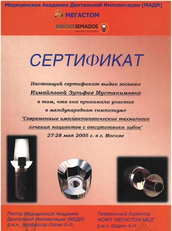 | 2005 | Международный конгресс «Современные имплантологические технологии лечения пациентов с отсутствием зубов» | Медицинская академия дентальной имплантации (МАДИ) | Москва | |