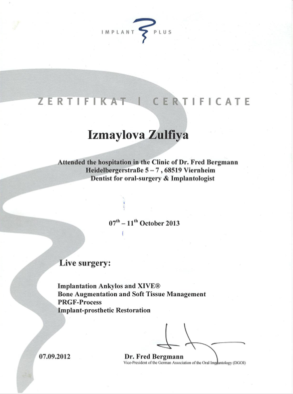 | 2013 | Индивидуальный практический курс обучения по хирургической стоматологии и имплантологии в клинике профессора Fred Bergmann | Профессор Fred Bergmann | Фирнхайм, Германия | |