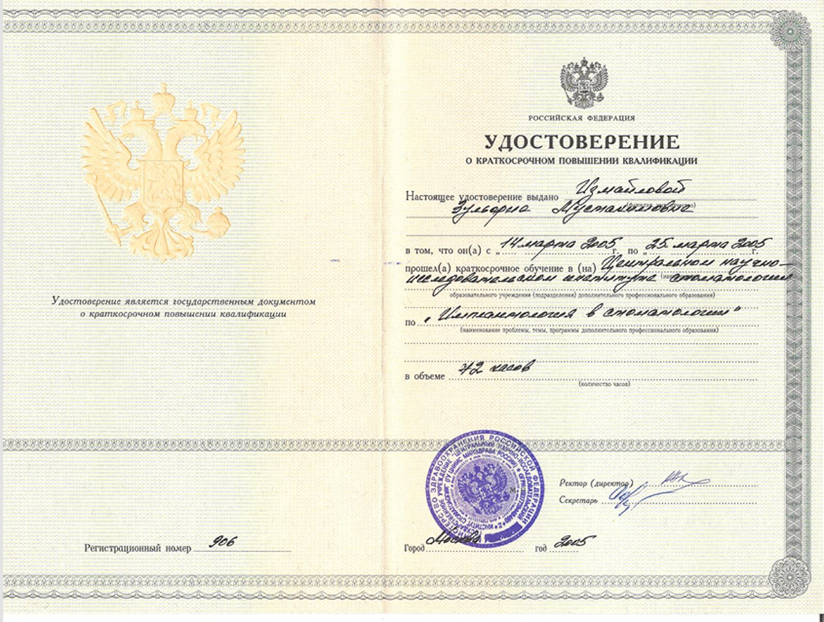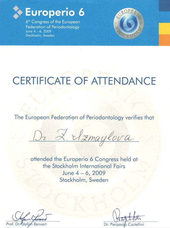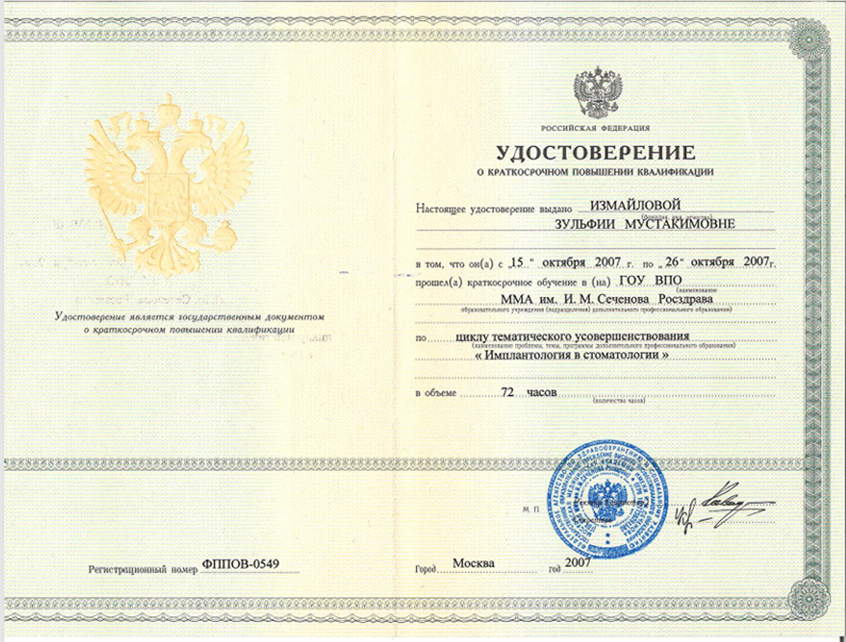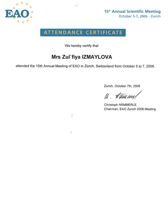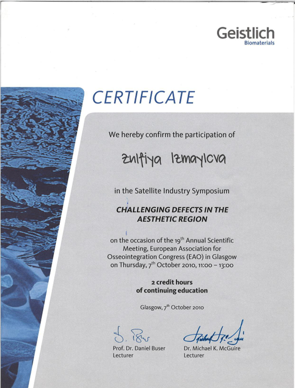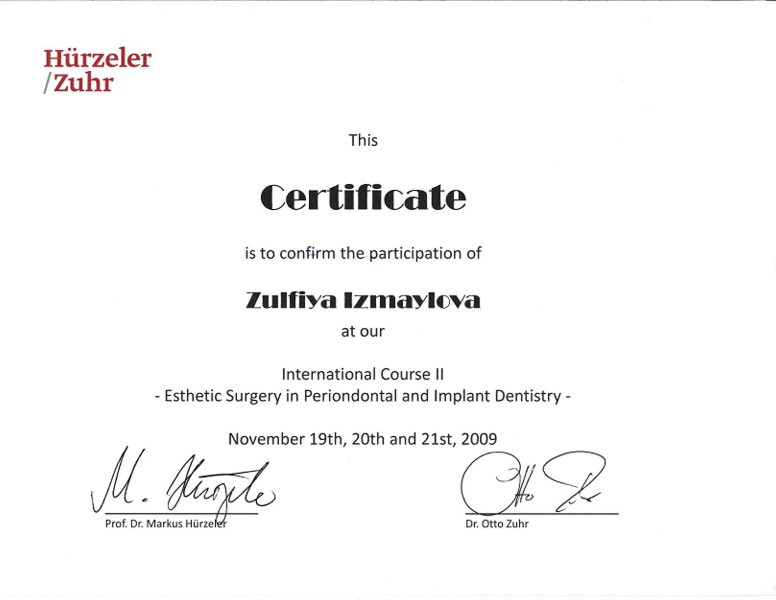 | 2009 | Международный курс «Esthetic surgery in periodontal and implant dentistry» («Эстетическая хирургия в периодонтальной и имплантологической стоматологии») | Профессор Hurzeler/Zuhr | Мюнхен, Германия | |
