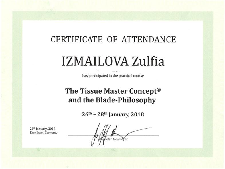 | 2018 | Практический курс «The tissue master concept and the blade-philosophy» («Концепция мастера ткани и философия лезвия») | Профессор Stefan Nuemeyer | Эшелькам, Германия | |