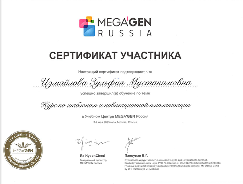 | 2025 | Курс по шаблонам и навигационной имплантации | Учебный центр Megagen Россия | Москва |