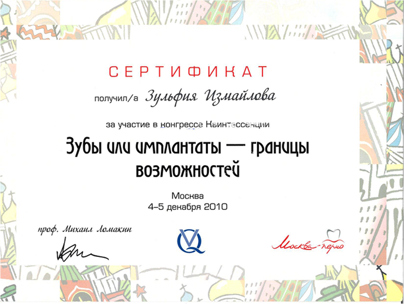| 2010 | Конгресс Квинтэссенции «Зубы или имплантаты – границы возможностей» | Квинтэссенция | Москва | |