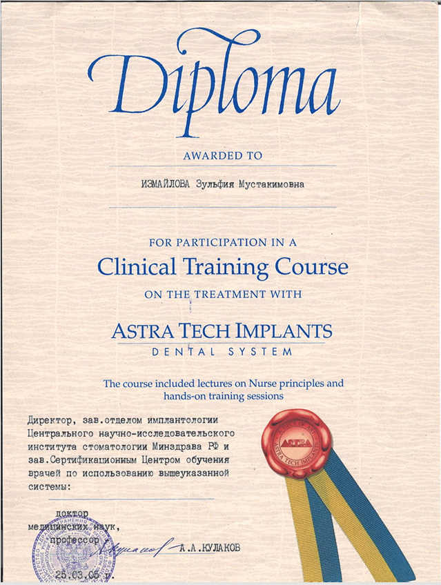 | 2005 | Практический курс по зубной имплантации Astra Tech | Компания Astra tech | Москва | |