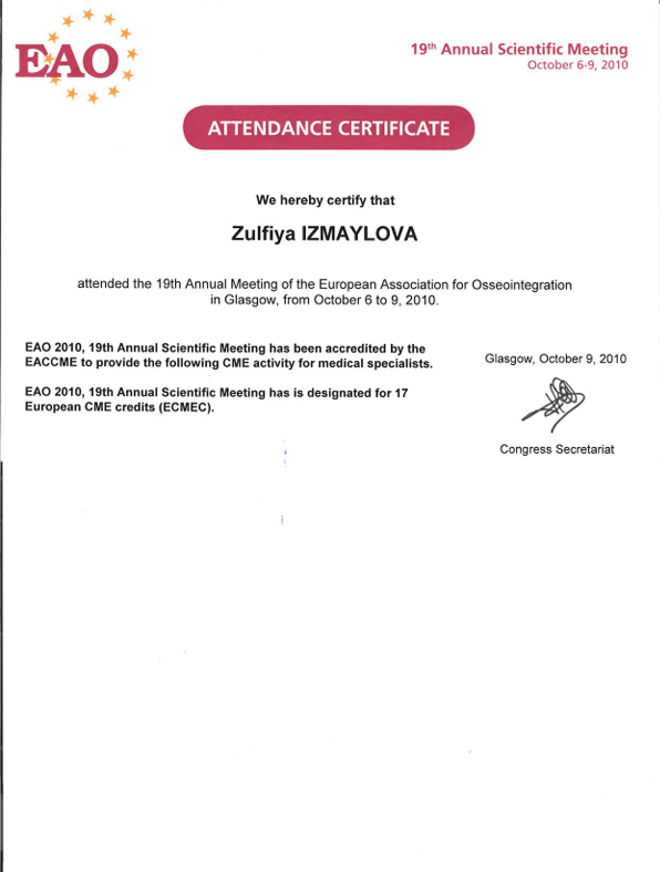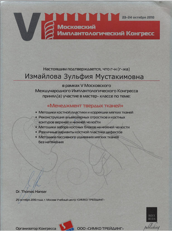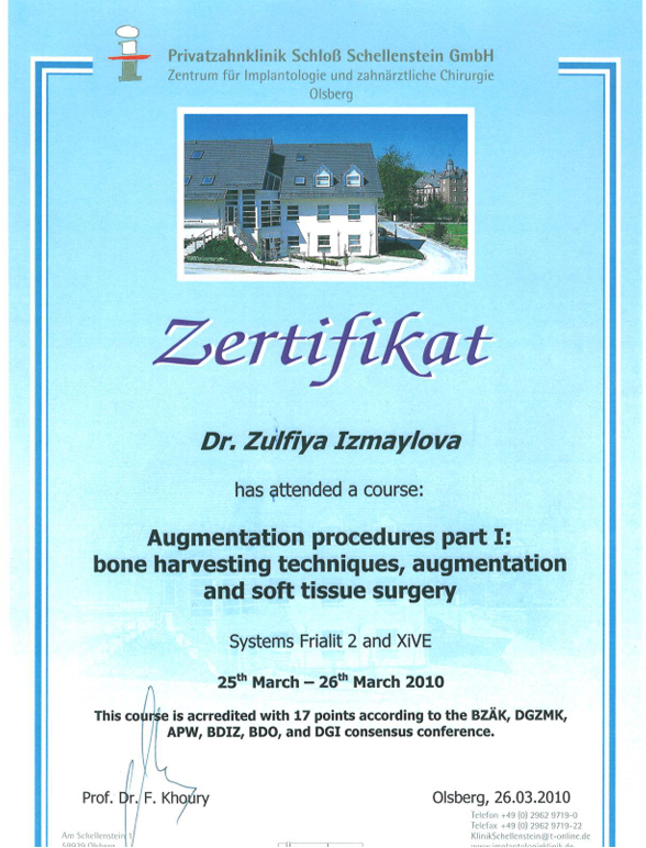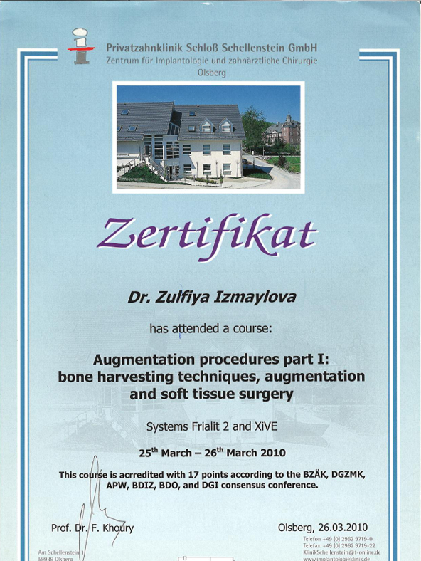| 2010 | Теоретический и практический курс «Augmentation procedures part I: bone harvesting techniques, augmentation and soft tissue surgery» («Хирургические методики аугментации костных и мягких структур») | Профессор F. Khoury (Кури) | Ольсберг, Германия | |
