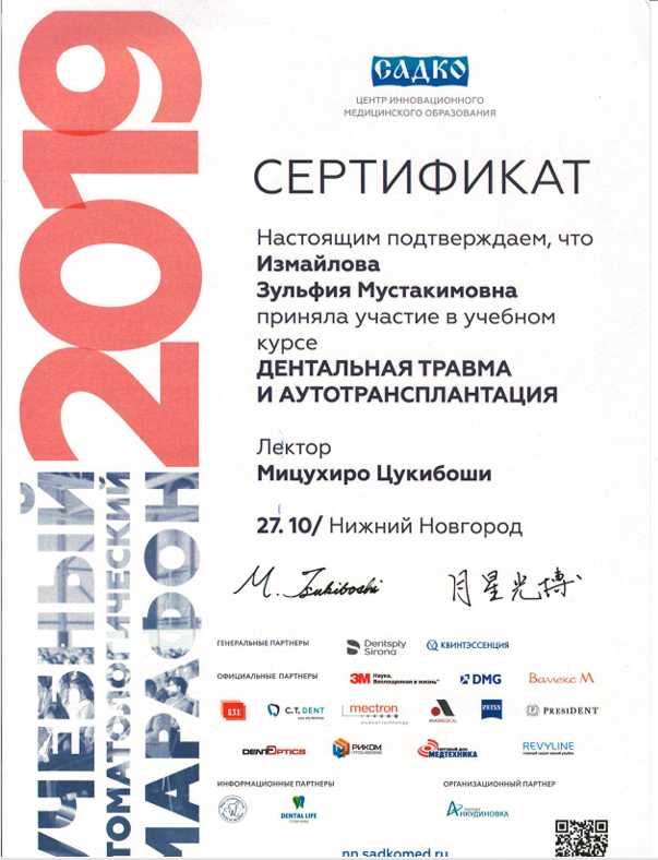| 2019 | Учебный курс «Дентальная травма и аутотрансплантация» лектор Мицухиро Цукибоши | Центр инновационного медицинского образования «Садко» | Нижний Новгород | |