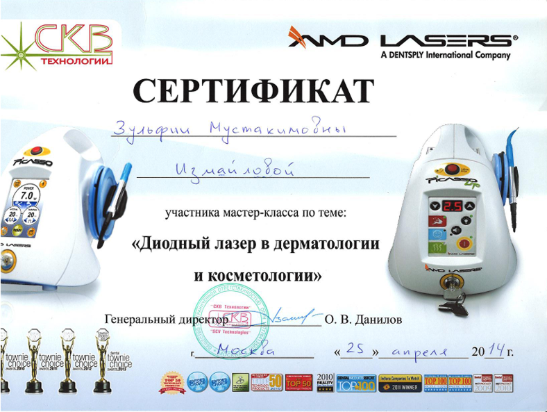 | 2014 | Мастер-класс «Диодный лазер в дерматологии и косметологии» | Международная компания Dentsply | Москва | |