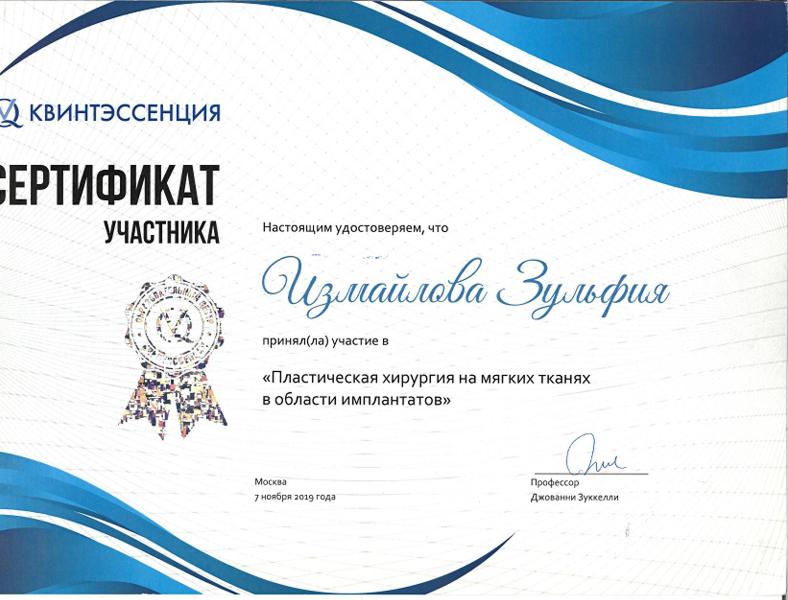 | 2019 | Теоретический курс Профессора Джованни Зуккелли «Пластическая хирургия на мягких тканях в области имплантатов» | Квинтэссенция | Москва | |