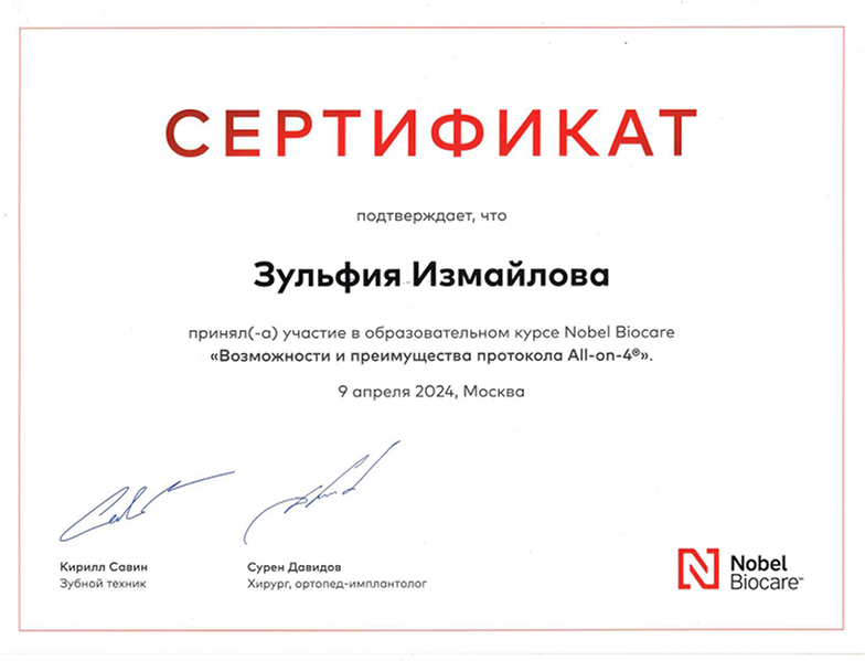 | 2024 | Образовательный курс «Возможности и преимущества протокола All-on-4» | Компания Nobel Biocare | Москва | |