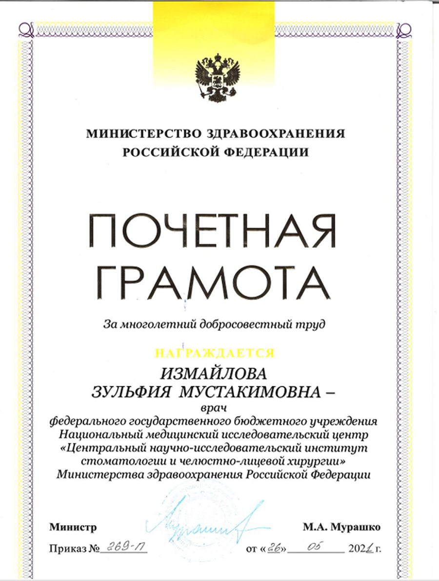 Стаж работы - 28 лет. Врач высшей квалификационной категории, кандидат медицинских наук, заслуженный врач РФ, эксперт по хирургической стоматологии.