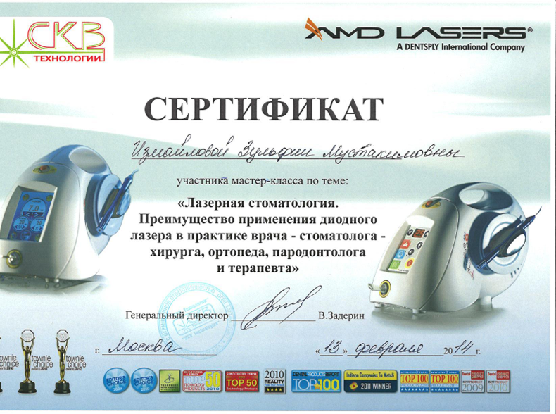 | 2014 | Мастер-класс «Лазерная стоматология. Преимущество применения диодного лазера в практике врача-стоматолога-хирурга, ортопеда, пародонтолога и терапевта» | Международная компания Dentsply | Москва | |