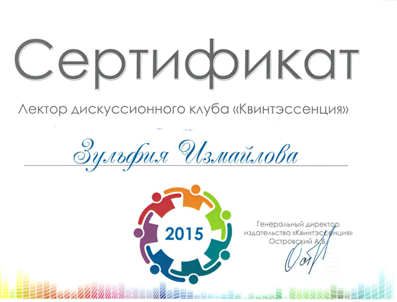 | 2015 | Лектор дискуссионного клуба «Квинтэссенция» | Квинтэссенция | Москва | |