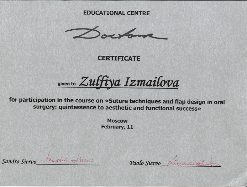 | 2011 | Практический курс («Техники наложения швов и дизайн лоскута в хирургической стоматологии: квинтэссенция эстетического и функционального успеха») | Образовательный центр «Доктур» | Москва | |