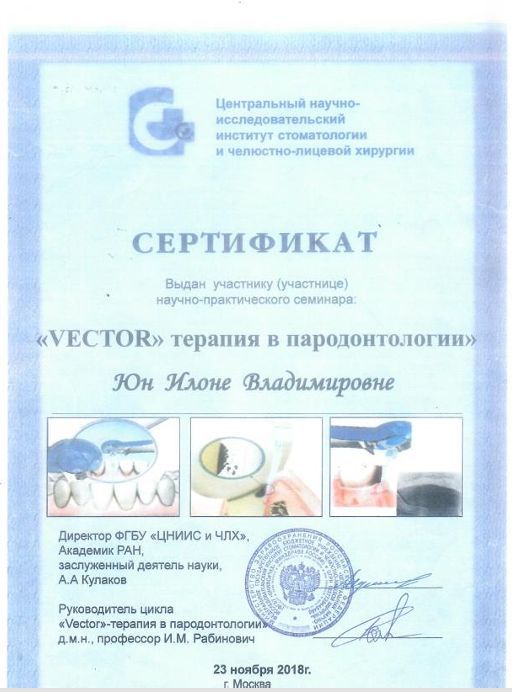 1999 г. Ординатура - ФУВС (факультет усовершенствования врачей-стоматологов) на базе ЦНИИС и ЧЛХ (Хирургическая стоматология)